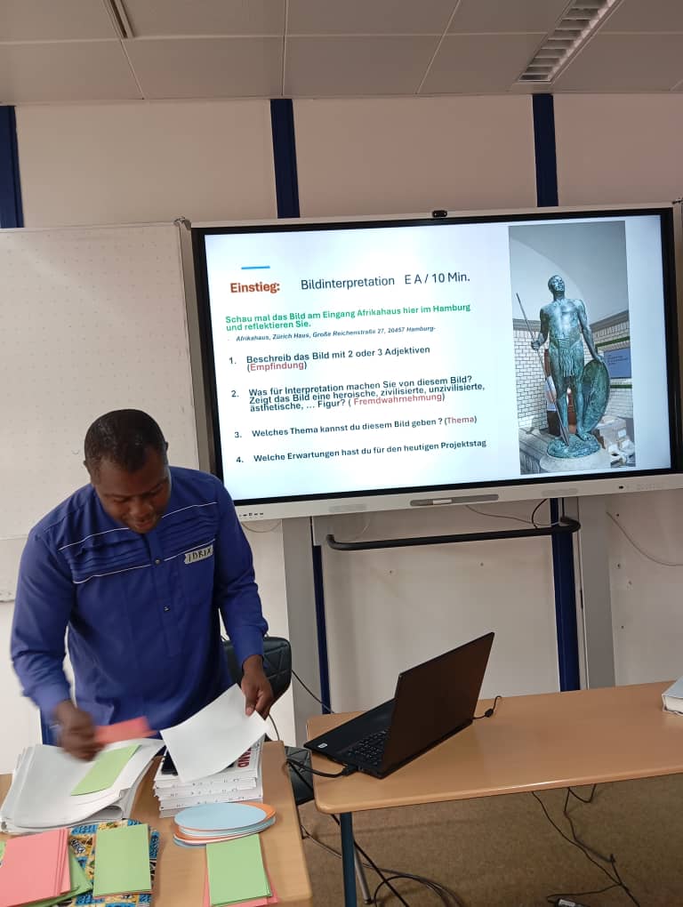 Was die Schulprojekte angeht, habe ich mit über 30 Schüler*innen in zwei deutschen Stadtteilschulen arbeiten können. Die Stimmung war sehr locker und die Schüler*innen haben sich sehr gern beteiligt. Es ging in den Projekten um eine Aufarbeitung des kolonialen Erbes in Hamburg als Kolonialmetropole mit dem Ziel, einen Perspektivwechsel in Bezug auf koloniale Diskurse, Rassismus und Ausgrenzung zu vollziehen sowie die Biografien afrikanischer Akteure in Hamburg zu reflektieren. Themen wie Völkerschauen, koloniale Spuren, Douala Manga Bell als Widerstandkämpfer oder auch die religiöse Legitimation der kolonialen Hierarchie stießen bei den Schüler*innen auf ein großes Interesse.
