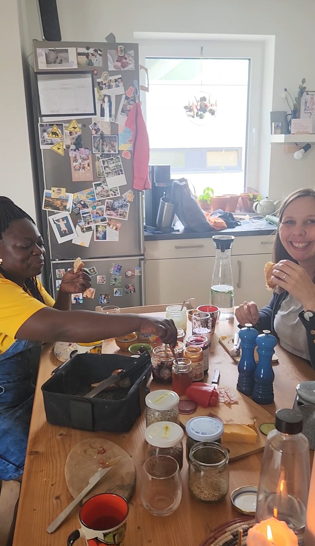 Am ersten Morgen haben wir zusammen gefrühstückt. Es gab frische Brötchen, Käse, Honig, Marmelade, Fisch, Milch, Tee, Kaffee, Eier… Ich fand das deutsche Frühstück sehr lecker.