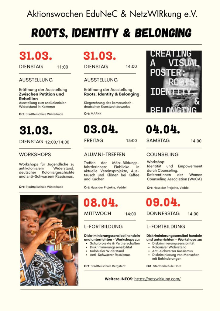 Die beiden Vereine EduNeC in Yaoundé (Kamerun) und NetzWIRkung e.V. in Hamburg (Deutschland) verbindet eine mehr als zehnjährige Kooperation durch Austauschbegegnungen, gemeinsame Erfahrungen in zahlreichen Projekten und intensive Diskurse um koloniale Kontinuitäten sowohl auf systemischer, bildungspolitischer als auch auf persönlicher Ebene. Gemeinsam setzen wir vielfältige, bildungspolitische Projekte um, wie zum Beispiel den Schulaustausch, Bildungsfahrten mit dem Fokus auf koloniale Kontinuitäten oder auch das Counseling-Projekt.