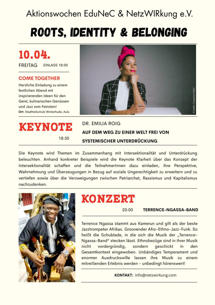 Ein Höhepunkt wird das Come-together, unser Abschlussfest, am Freitag, den 10. April sein, zu dem wir Dr. Emilia Roig für eine einstündige Keynote sowie als musikalisches Highlight die Terrence-Ngassa-Band mit ihrem mitreißenden groovenden Afro-Ethno-Jazz-Funk eingeladen haben.
